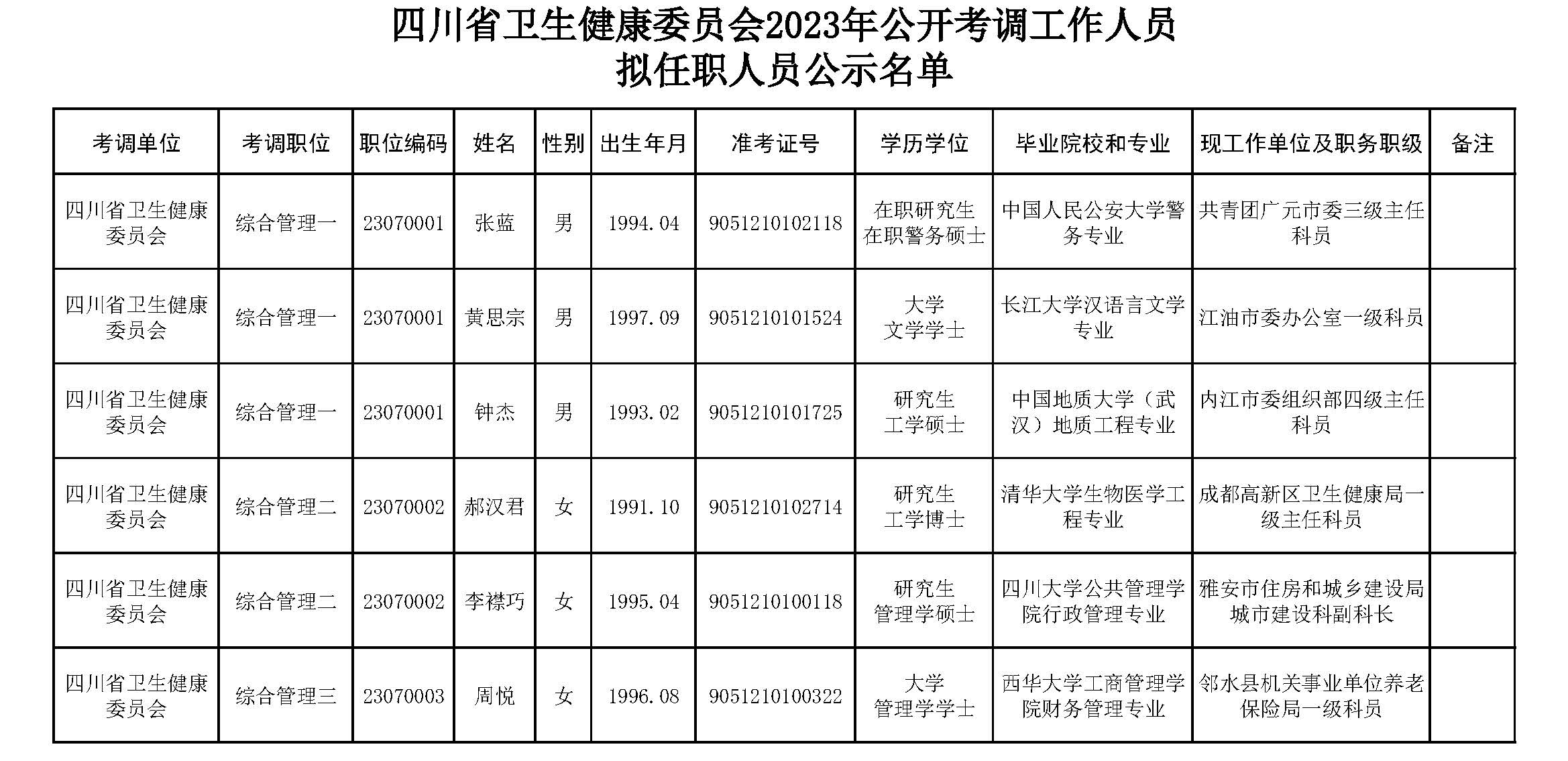 根据《四川省卫生健康委员会关于2023年公开考调工作人员的公告》规定,经笔试、面试、体检、差额考察和顶岗试用,拟确定张蓝等6名同志为四川省卫生健康委员会2023年公开考调工作人员拟任职人员,现予公示。