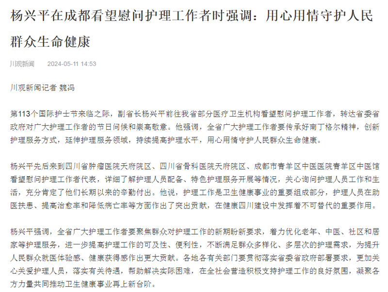 杨兴平在成都看望慰问护理工作者时强调:用心用情守护人民群众生命健康